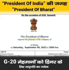 राष्ट्रपति द्वारा जी-20 आयोजन पर अपने निमंत्रण पत्र पर प्रसिडेंट आँफ भारत अंकित।