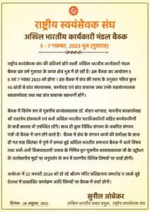 राष्ट्रीय स्वयंसेवक संघ की तीन दिवसीय अखिल भारतीय कार्यकारी मंडल बैठक भुज (गुजरात) में 5 से 7 नवम्बर October 30, 2023